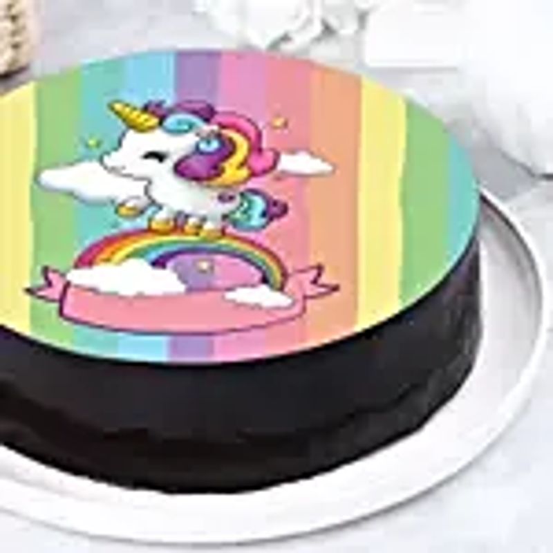 A delicious chocolate cake decorated with colorful rainbow designs and a cute unicorn theme, featuring a printed edible photo on top. Perfect for birthdays and special celebrations, especially for kid...A delicious chocolate cake decorated with colorful rainbow designs and a cute unicorn theme, featuring a printed edible photo on top. Perfect for birthdays and special celebrations, especially for kids who love magical and colorful cakes.